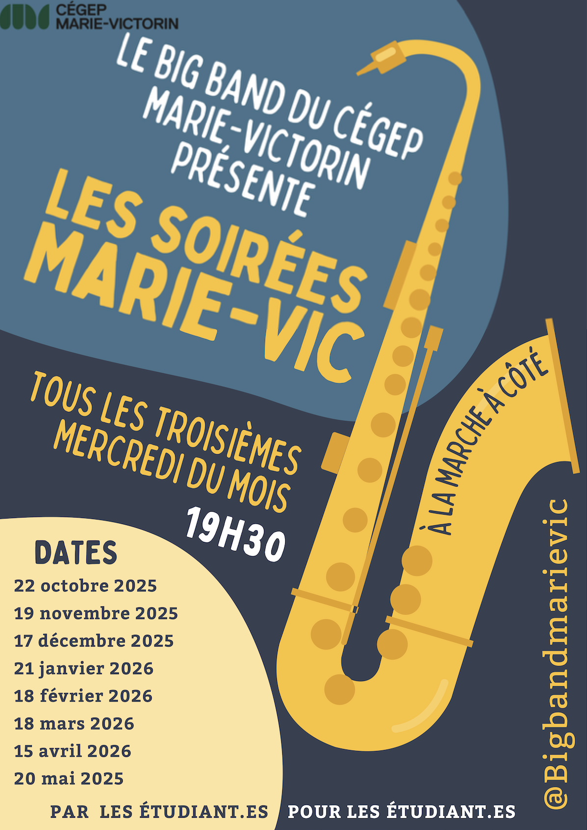 Chaque troisième mercredi du mois, de septembre à mai, des étudiantes et étudiants du Big Band se produisent à La Marche à côté. Organisé par nos étudiantes et étudiants, cet événement est une belle occasion de découvrir le talent qui foisonne dans le Département de musique du Cégep!
