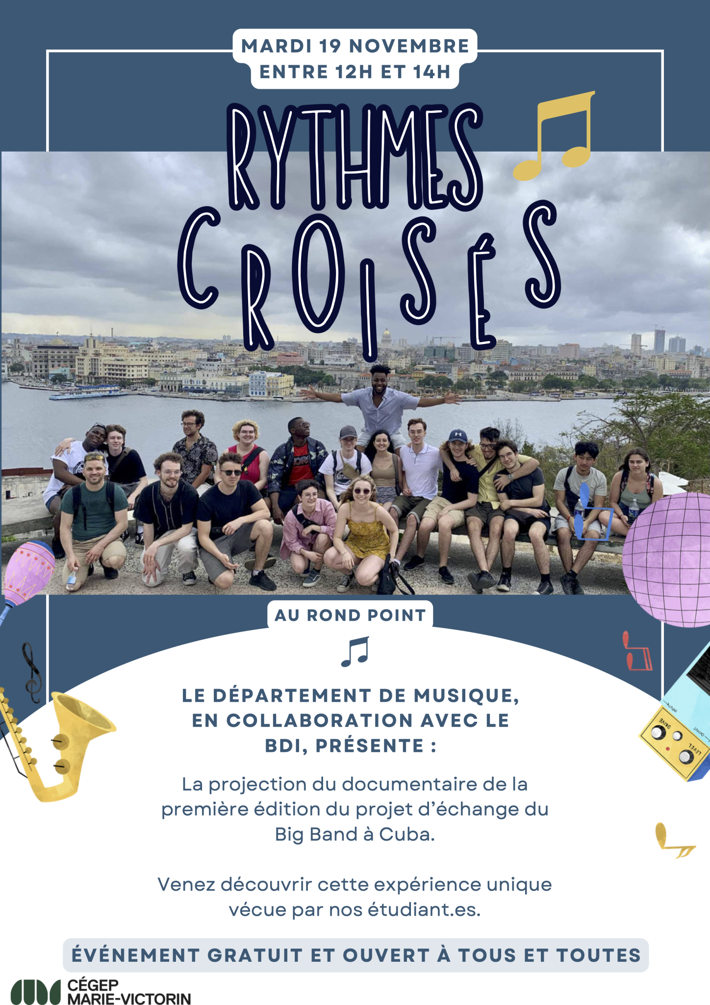 Le Département de musique, en collaboration avec le Bureau de développement international, vous invite à la projection du documentaire Rythmes Croisés, qui retrace le projet d’échange du Big Band à Cuba. Plongez au cœur de cette aventure culturelle et musicale unique, où le jazz rencontre la musique cubaine, à travers des images et des témoignages captivants de nos étudiantes et étudiants.