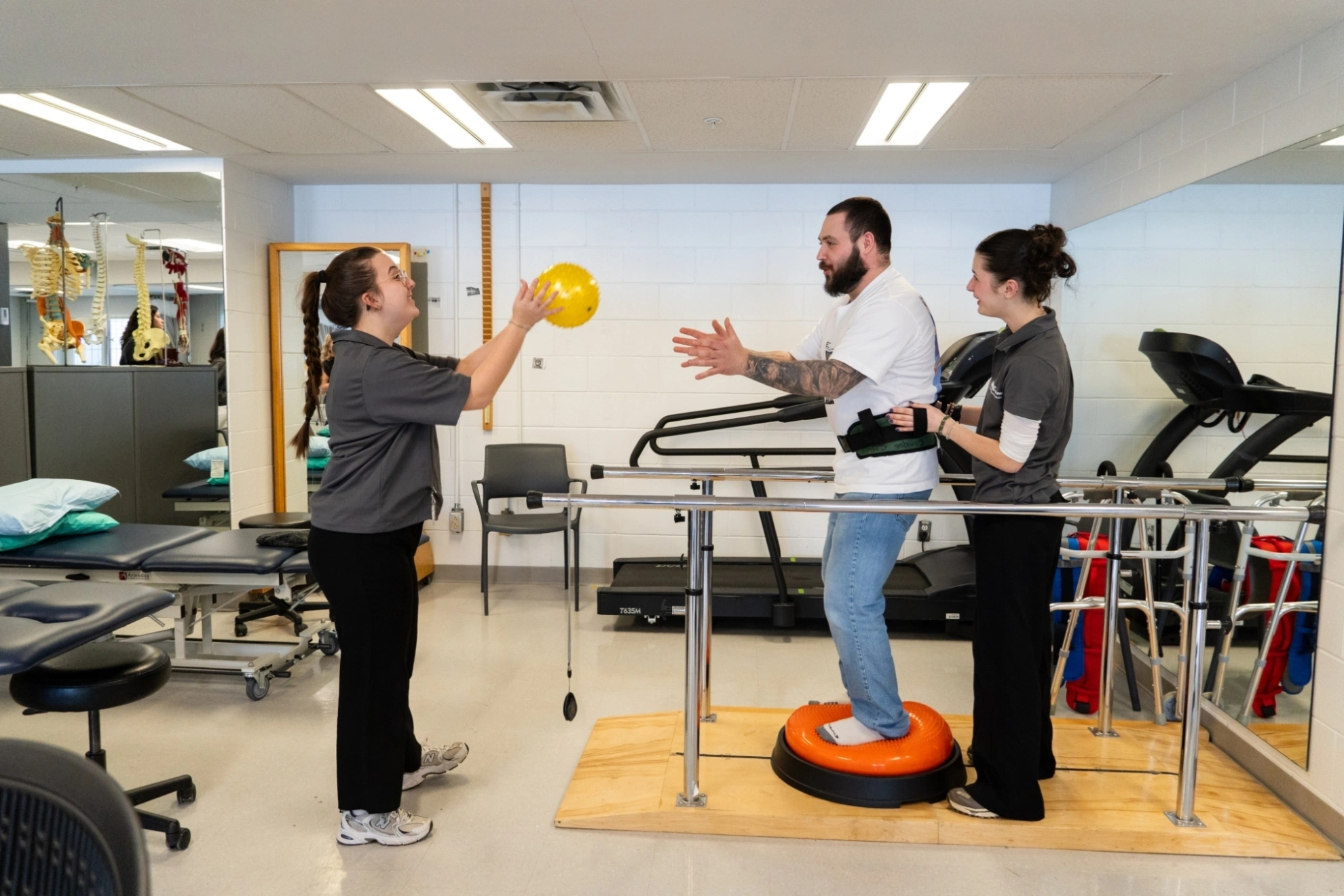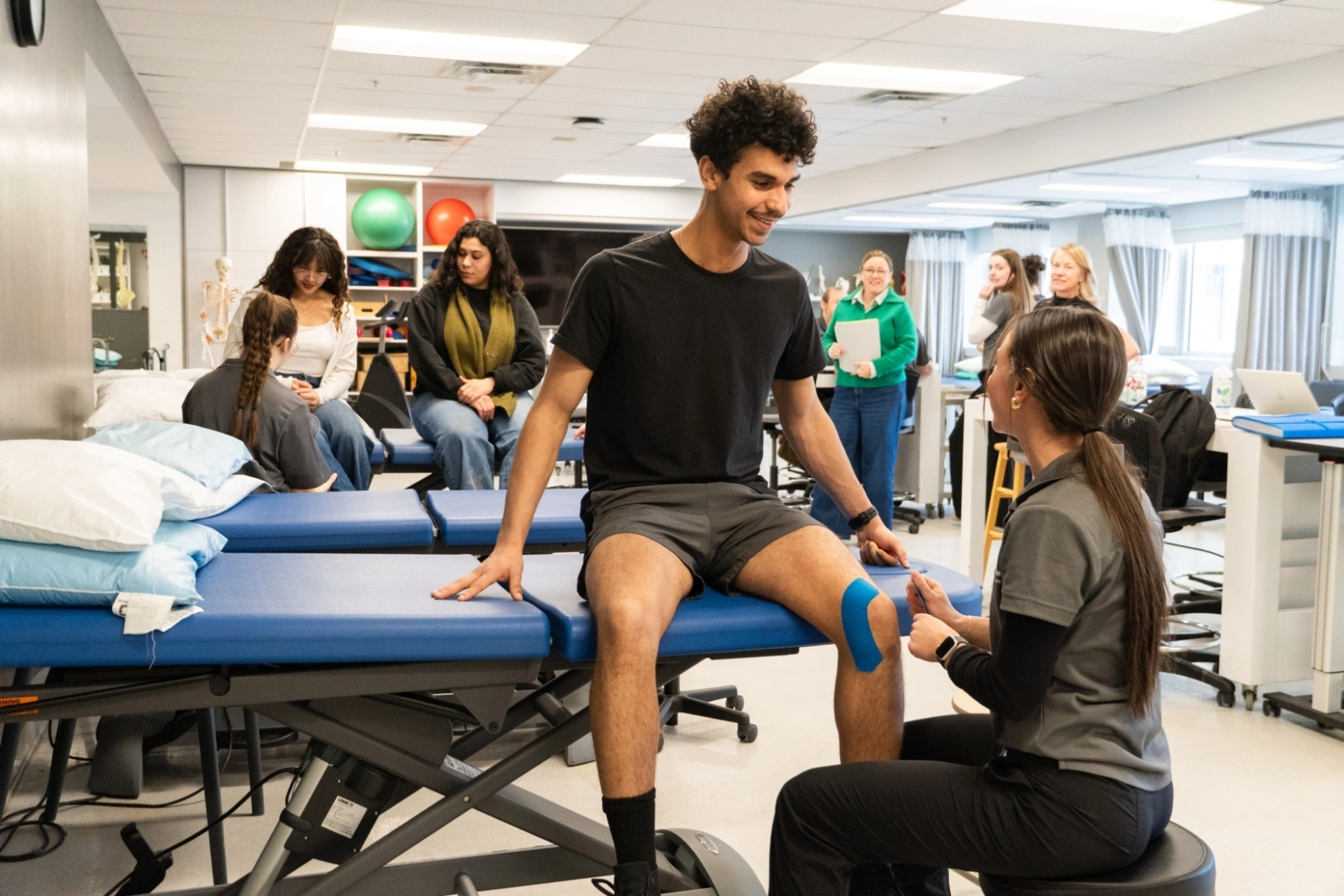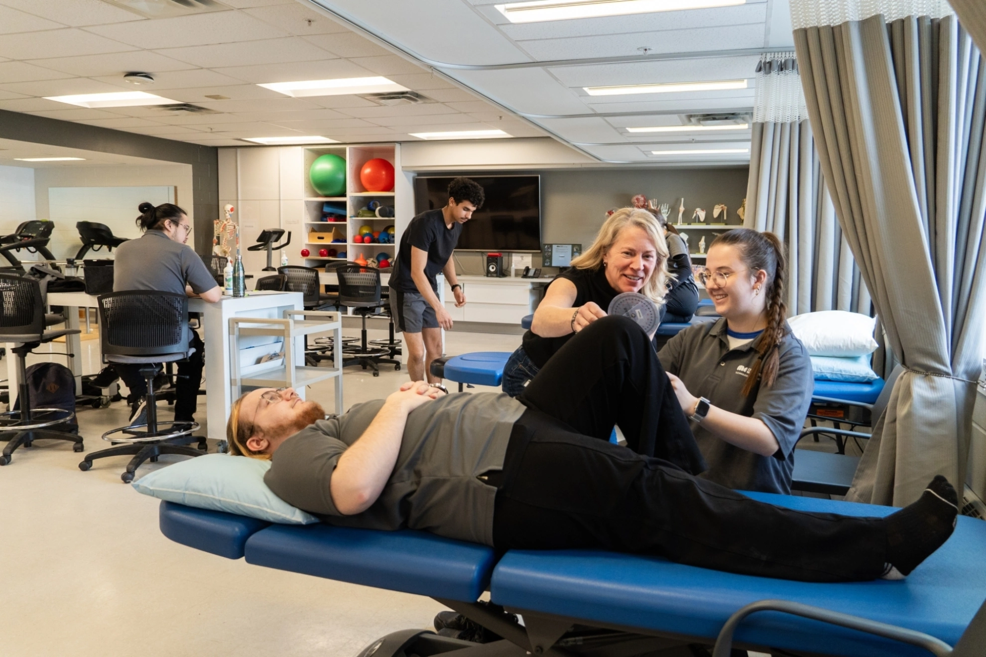Les étudiantes et étudiants en Physiothérapie du Cégep Marie-Victorin se trouvent dans la clinique-école de l'établissement. Ils procèdent à des manipulations physiques entre collègues et apprennent par la mise en pratique. La théorie apprise est ainsi réinvestie en clinique. Les étudiantes et étudiants du Cégep Marie-Victorin ont de nombreux outils et matériels qui les aident à soigner leurs patients.