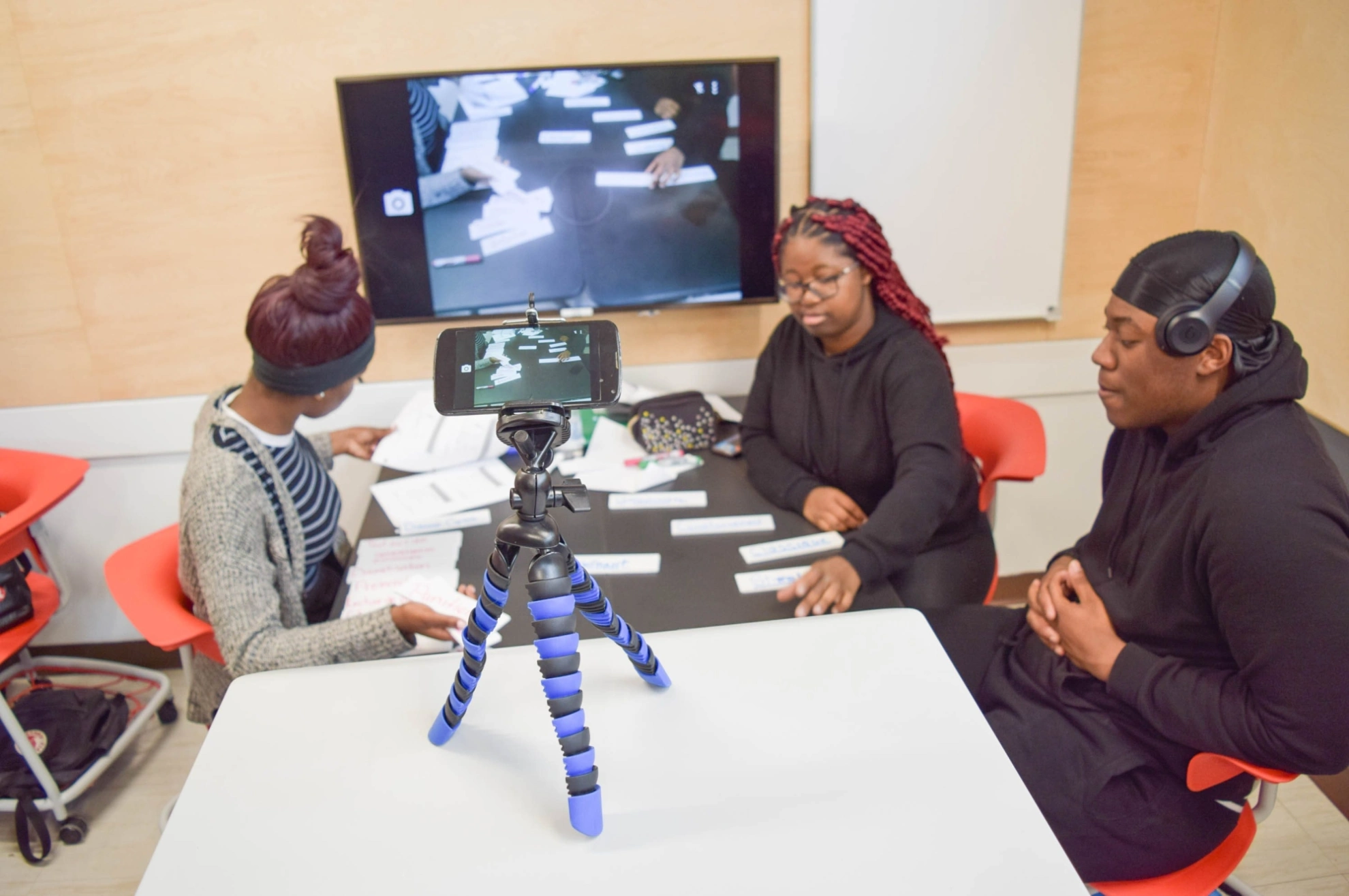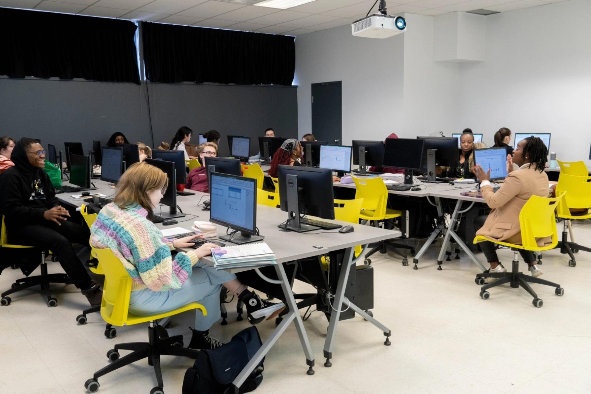 Étudiantes et étudiants en Sciences humaines du Cégep Marie-Victorin dans une classe interactive. Ils travaillent sur un projet, en groupe.